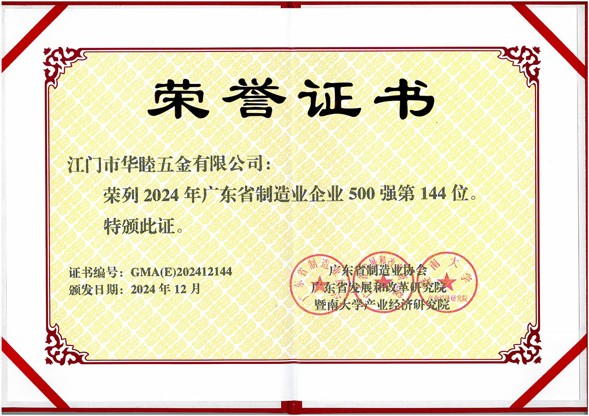華睦榮列2024年廣東省制造業(yè)企業(yè)500強第144位