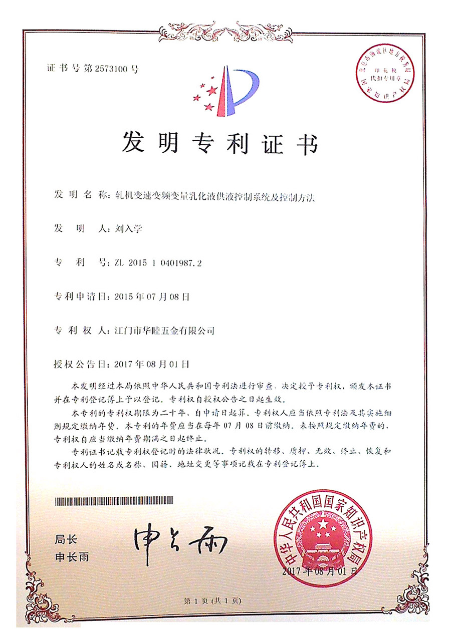 授予 江門市華睦五金有限公司 生產(chǎn)的"華睦"牌冷軋鋼板
