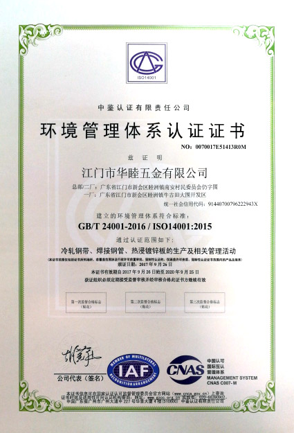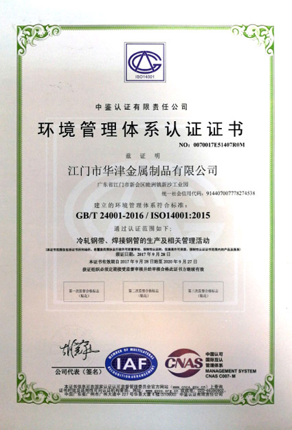 2017年9月,本公司之公司江門華津金屬制品有限公司(以下簡稱“華津”)及江門市華睦五金有限公司(以下簡稱“華睦”)分別收到由中鑒認(rèn)證有限責(zé)任公司所頒發(fā)的《環(huán)境管理體系認(rèn)證證書》(證書編號分別為:0070017E51407R0M號及0070017E51413R0M號)。