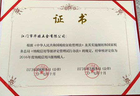2017年10月,本公司之公司江門華津金屬制品有限公司(以下簡稱“華津”)及江門市華睦五金有限公司(以下簡稱“華睦”)收到江門市國家稅務(wù)局及江門市地方稅務(wù)局所頒發(fā)的《2016年度納稅信用A級(jí)納稅人證書》。